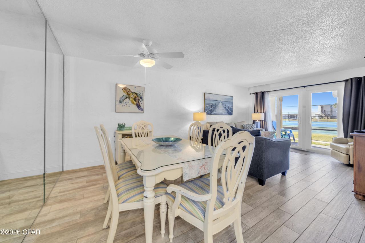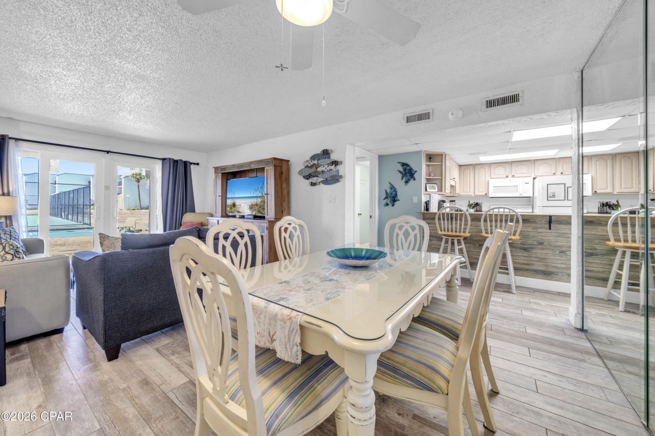 Fantastic opportunity at Sugar Beach, a Gulf-front community ideally located on Thomas Drive. This ground-level 2-bedroom, 2-bath residence offers 1,086 square feet of well-designed living space and a rare combination of convenience, comfort, and direct beach access. Unlike upper-floor units, this condo allows true indoor-outdoor living?no elevators, no stairs?just effortless access to the sand and Gulf waters. The open-concept living and dining area is bright and inviting, with large windows that fill the space with natural light. All windows and exterior doors, including the sliding glass doors, have been recently replaced, offering improved energy efficiency, storm protection, and long-term peace of mind. Durable ceramic plank flooring throughout ensures low-maintenance ownership, ideal for both personal use and rental performance. The thoughtful split-bedroom layout provides privacy for owners and guests alike, making it equally suited as a primary residence, second home, or income-producing investment. All air ducts have been recently cleaned, enhancing interior air quality and overall comfort. Sugar Beach is a well-maintained, beachfront community featuring resort-style amenities including a pool and direct Gulf access. Owners and guests enjoy the simplicity of coastal living, with dining, shopping, and entertainment just minutes away?offering the perfect balance of relaxed beach lifestyle and everyday convenience.